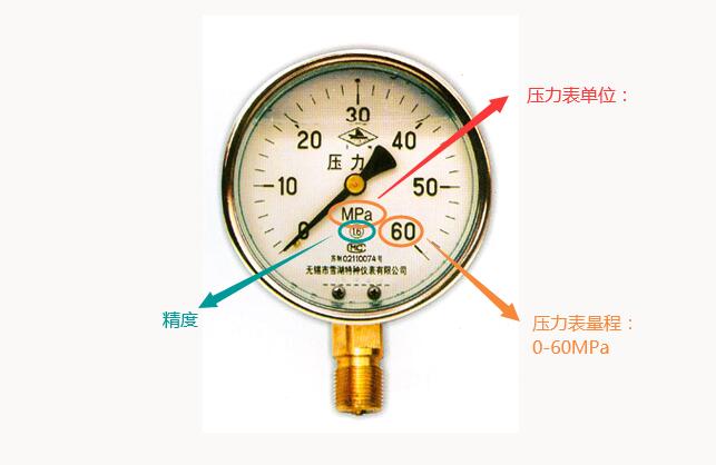 從上圖可以看到,該壓力表的單位是MPa,最大量程是60MPa,最小量程是0MPa,所以全量程是0~60MPa。壓力表的刻度是均等標(biāo)識(shí)的,由此可以看出壓力表由10、20、30、40、50、60均分,便于讀取,而等分?jǐn)?shù)字之間每一個(gè)刻度就是2MPa。