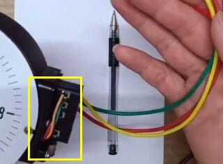 在側(cè)面一般的話呢,會有三個控制線,黃綠紅,其實它這邊的三個控制線就等同于三個表針,這個綠色的為我們的下限表針,這個紅色的為上限表針,那么這個黃色的所代表的就我們的公共端,那么當(dāng)前的實驗的表針。